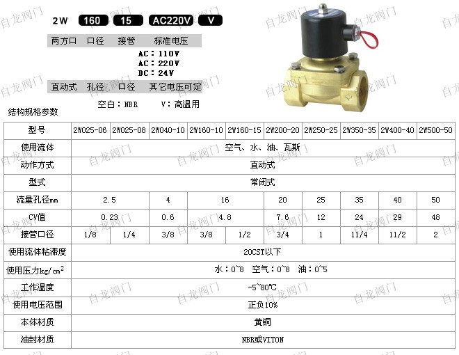 上海自龍閥門生產(chǎn)的2W型電磁閥,是全銅閥門,線圈是由全銅線制作而成,閥體鍛銅鑄成,防銹衛(wèi)生上可以延長其使用壽命,中部密封由進(jìn)口膜片組成,實(shí)驗(yàn)壽命開啟閉合多達(dá)兩萬余次,是一款質(zhì)量非常好的暢銷產(chǎn)品。