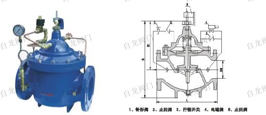 上海自龍閥門制造有限公司生產(chǎn)的700X水泵控制閥由主閥、電磁導(dǎo)閥、針閥、球閥、單向閥、行程開(kāi)關(guān)、微形過(guò)濾器和壓力表組成水力控制接管系統(tǒng)。水泵需停止工作時(shí),先由進(jìn)口壓使主閥關(guān)閉90%后,水泵停止運(yùn)轉(zhuǎn)。剩余10%由回水關(guān)閉??煞乐顾N現(xiàn)象發(fā)生。700X多功能水泵控制閥利用電磁導(dǎo)閥控制,不需要其它裝置和能源。節(jié)約能源,保養(yǎng)簡(jiǎn)便,停泵平穩(wěn)。電磁閥可采用交流電220V或直流電24V。700X多功能水泵控制閥產(chǎn)品廣泛用于高層建筑、生活區(qū)等供水管網(wǎng)系統(tǒng)及城市供水工程。當(dāng)水泵工作閥門向下游供水時(shí),電磁導(dǎo)閥全開(kāi),針閥調(diào)至適當(dāng)開(kāi)度,上游水經(jīng)針閥、單向閥進(jìn)入主閥控制室,經(jīng)電磁導(dǎo)閥流出,此時(shí)主閥控制室的壓力保持主閥處于合適的開(kāi)度,保持下游正常供水。當(dāng)水泵停止工作時(shí),電磁導(dǎo)閥先關(guān)閉,主閥控制室停止排水,控制室壓力升高,主閥開(kāi)始關(guān)閉。當(dāng)關(guān)閉至90%時(shí),主閥上部行程開(kāi)關(guān)輸出停泵信號(hào),水泵停止運(yùn)轉(zhuǎn)。此時(shí)下游回水經(jīng)單向閥進(jìn)入主閥控制室,控制室壓力升高,主閥被關(guān)閉。
